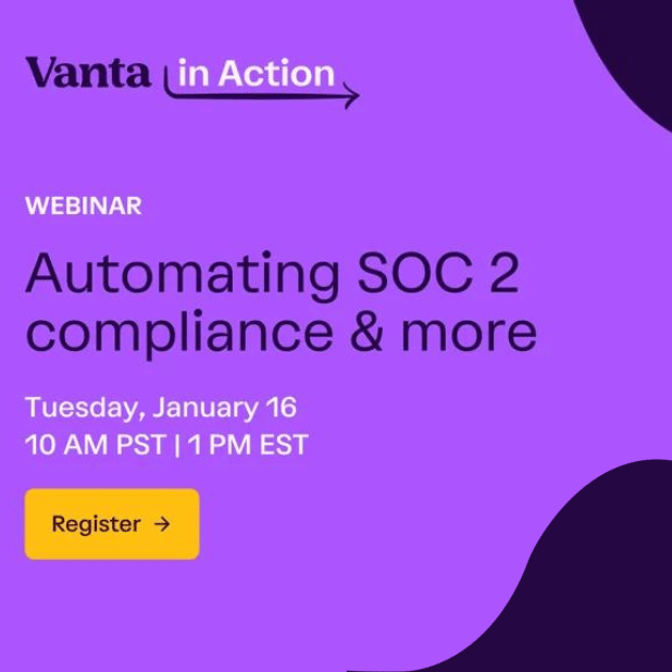 Join Vanta's 45-minute live product demo on January 16th at 10 am PST and 1 pm EST to learn how Vanta's trust management platform automates up to 90% of tasks for SOC 2, ISO 27001, GDPR, HIPAA, and more.